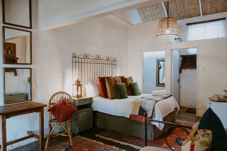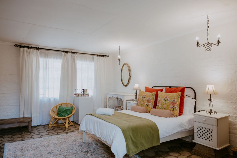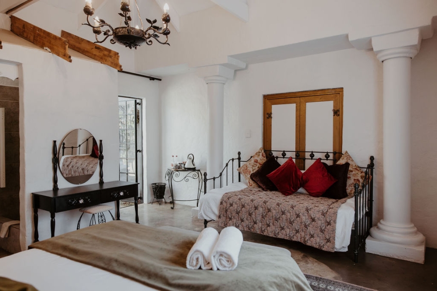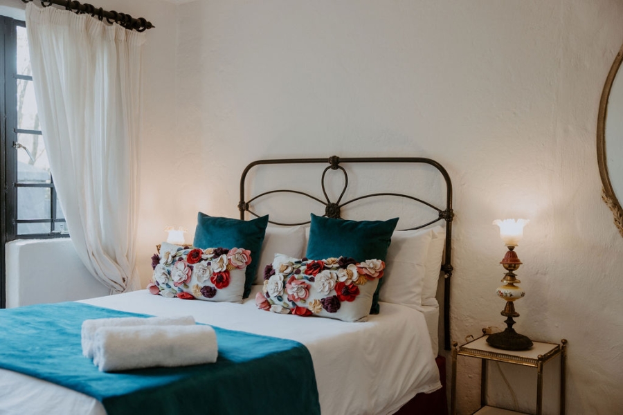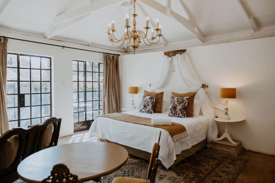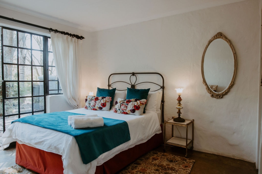 This room features an exterior door that opens to a stunning garden, complete with towering century-old trees and elegant French garden furniture. Inside, you'll find a spacious layout with a luxurious double bed, and a daybed for an additional guest (R250.00 extra), a convenient workstation, and a separate private shower.