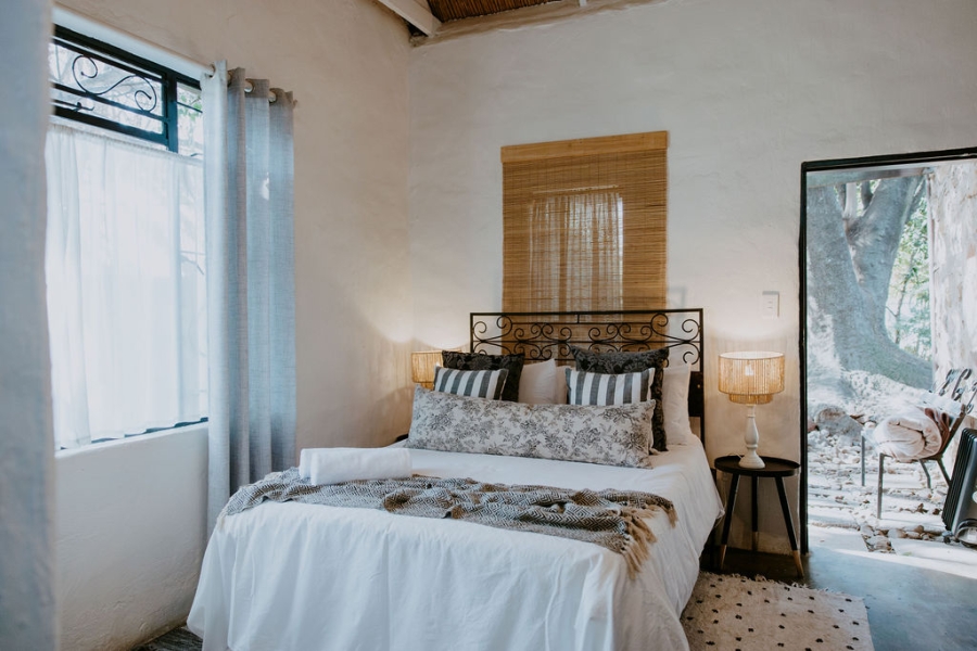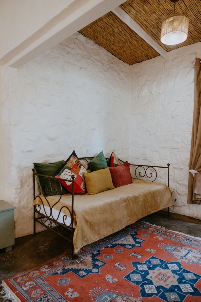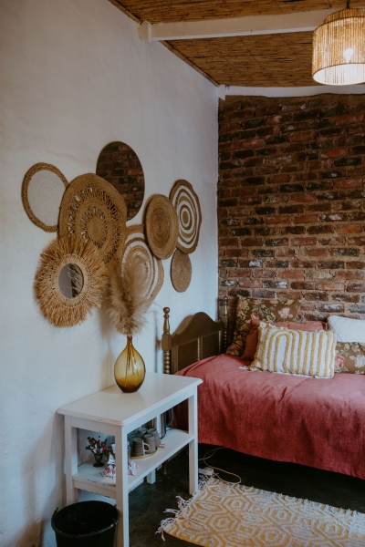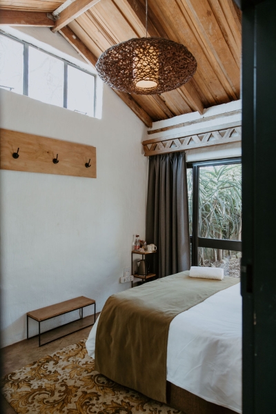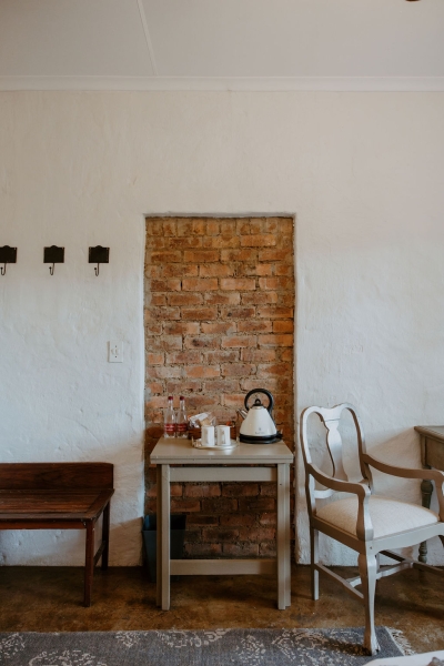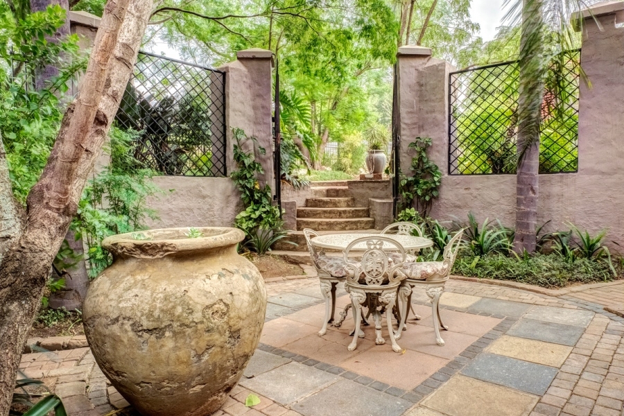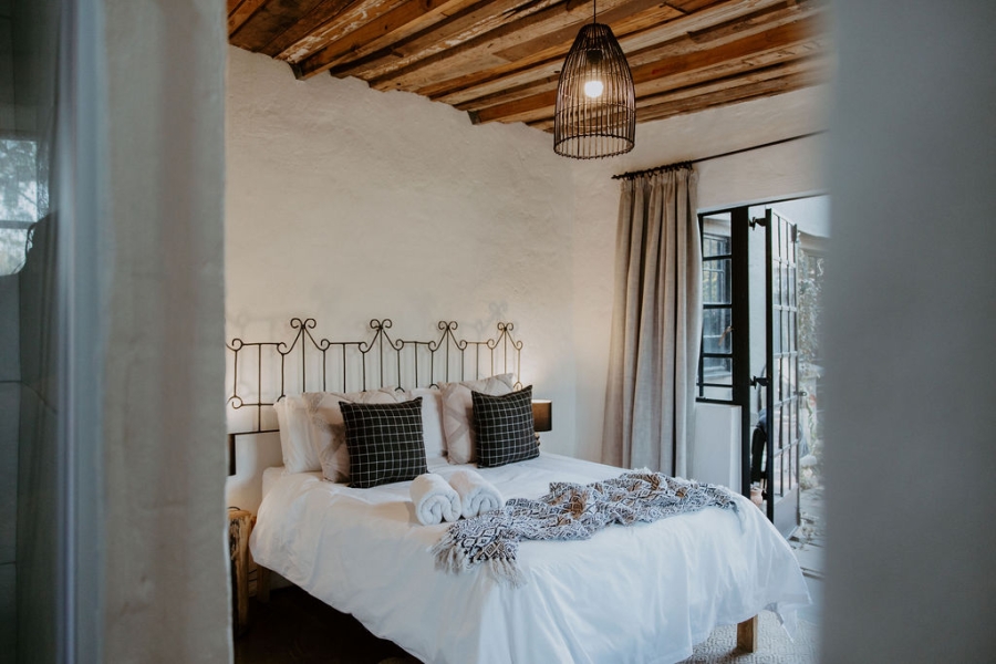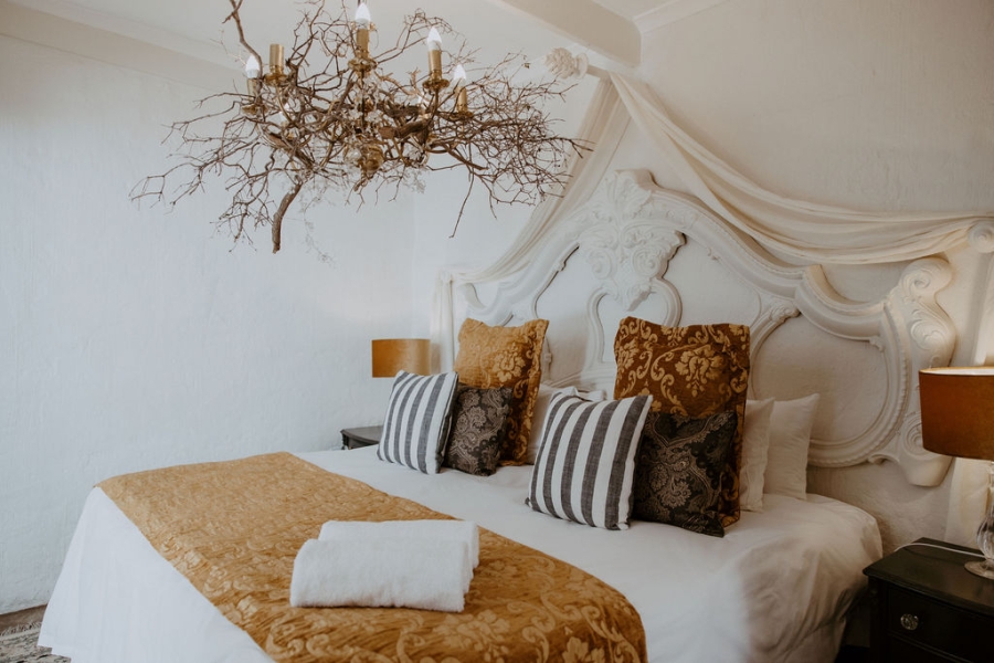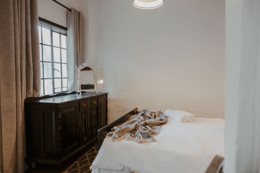 This room features an exterior door that opens to a stunning garden, complete with towering century-old trees and elegant French garden furniture. Inside, you'll find a spacious layout with a luxurious double bed, and a daybed for an additional guest (R250.00 extra), a convenient workstation, and a separate private shower.