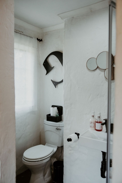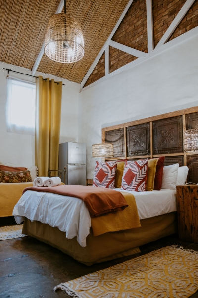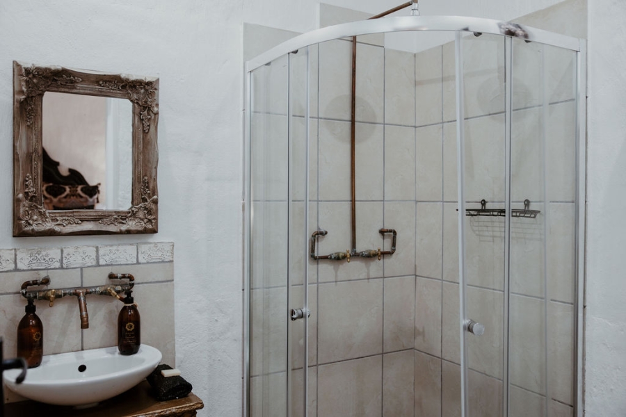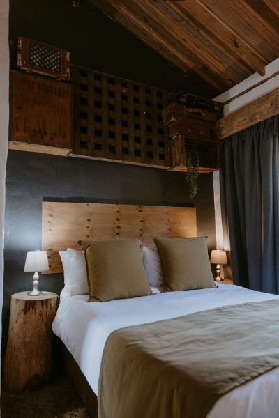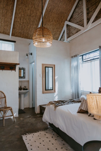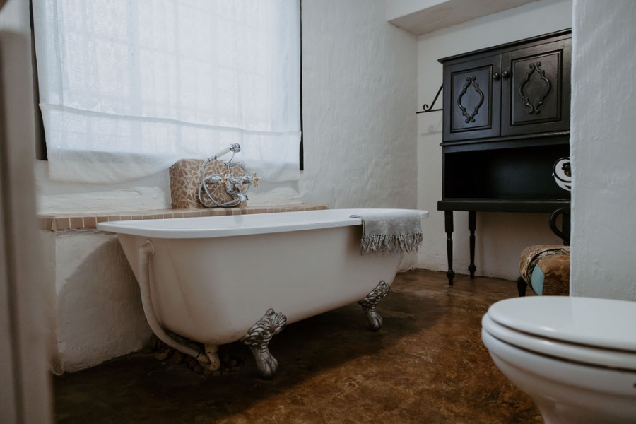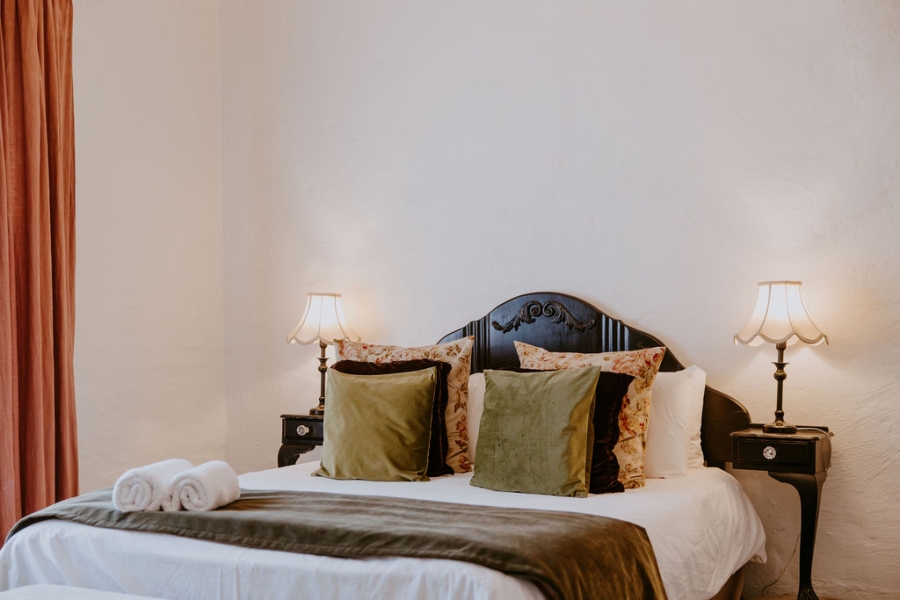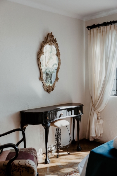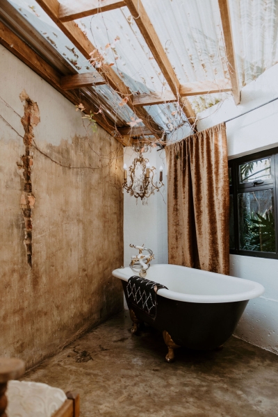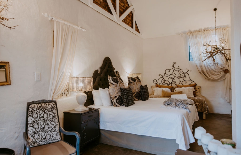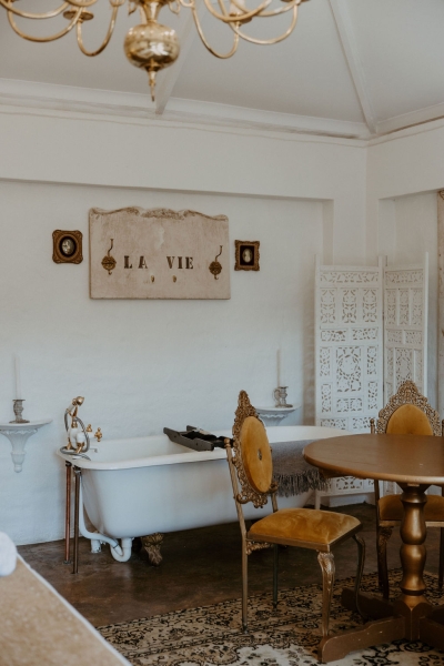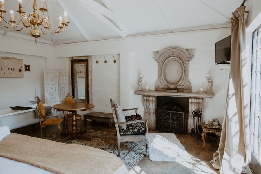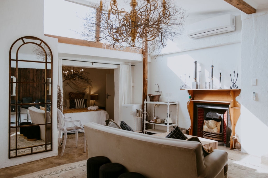 Our Main Honeymoon Suite is an expansive and enchanting retreat, featuring a beautifully restored Victorian clawfoot bath set beneath a glass roof—allowing you to bathe under the stars! The suite boasts a generous living area with a charming couch and ottoman positioned in front of an antique fireplace. For added romance and privacy, it includes a secluded courtyard nestled beneath the canopy of a majestic Wild Seringa tree.