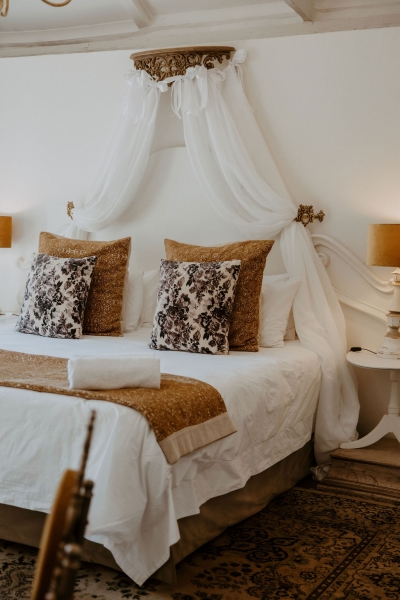 The room boasts an exterior stable door that opens onto a stunning garden, complete with towering century-old trees and elegant French garden furniture. Inside, the spacious and romantic setting features a luxurious king-size bed and a cozy reading chair. A separate, private shower adds to the comfort and convenience of your stay.