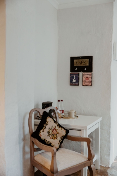 A beautiful room adorned with a double bed, complemented by a cozy reading chair and a convenient workstation. Private bathroom with a shower. Access to a charming communal courtyard for unwinding, enhancing your stay with a touch of scenic beauty.